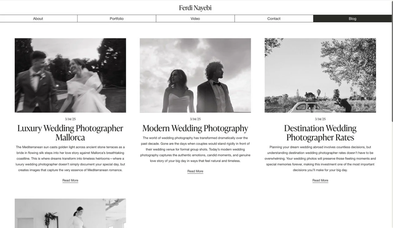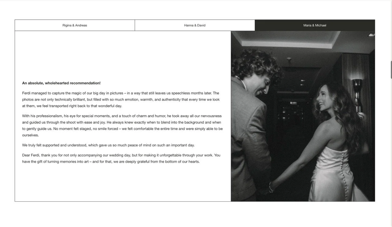 Ferdy Nayebi ist Hochzeitsfotograf & Videograf mit einem klaren Signature-Look: editorial, zeitlos und hochwertig – für Paare, die Ästhetik lieben und ihre Hochzeit bewusst erleben wollen. Die neue Website bringt genau dieses Gefühl auf den Bildschirm: clean, elegant und kompromisslos fokussiert auf Bilder, Emotionen und Anfragen.