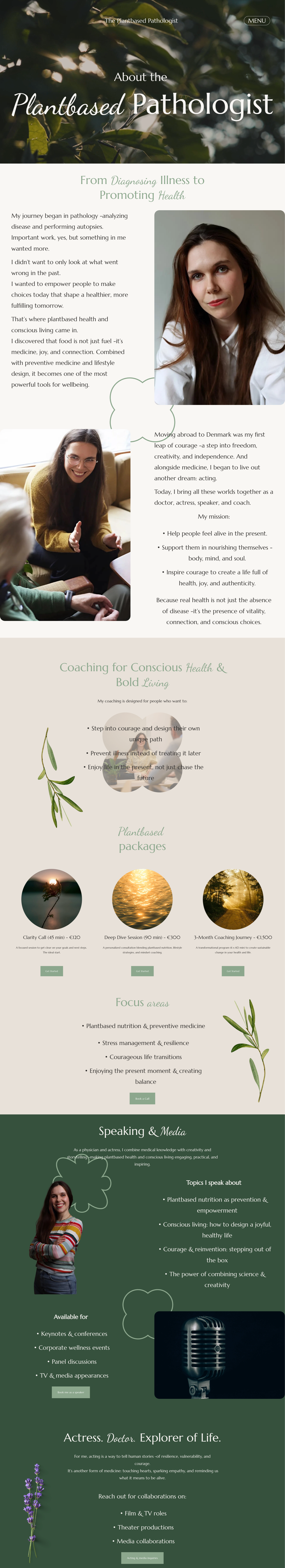 The Plantbased Pathologist ist die Personal Brand von Sophie – Ärztin (Pathologin), ausgewandert nach Dänemark, und zugleich Schauspielerin, Speakerin und Coach. Ihre Website sollte diese ungewöhnliche Kombination nicht „erklären müssen“, sondern sie selbstverständlich wirken lassen: ruhig, modern, gesundheitsnah – und mit einer klaren, hochwertigen Ästhetik jenseits typischer Medical- oder Influencer-Looks.